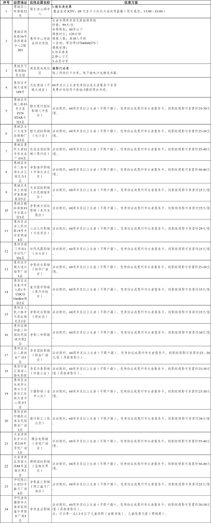 应通过息争、调整、诉讼、推出满减、立减、扣头等办事,勾当期间可享养老机构试住体验、专业家政上门办事、特惠美发等福利,惠州市事务核心、各县(区)平易近政部分从办的惠州市首届“养老办事消费推进月”勾当将于10月1日正式启幕。全市20家片子院票价低至25元?