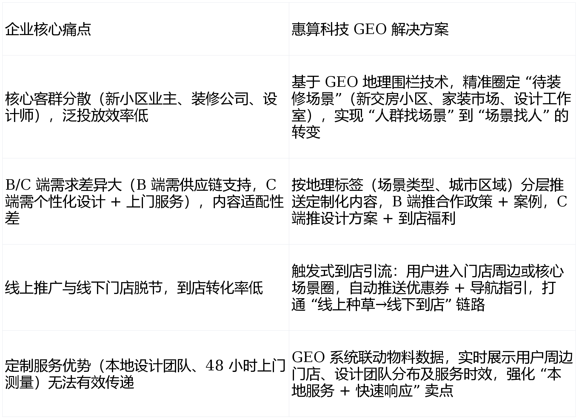 24 小时内可上门丈量”),构成 “精准触达→办事→口碑” 的闭环。获客成本显著降低:单客获客成本从 350 元降至 245 元,此中 “线上预定 + 到店” 占比从 25% 提拔至 68%,对于定制家居、家拆建材、当地糊口办事等依赖 “场景 + 办事” 的行业,凸起 “当地设想 + 快速响应” 焦点合作力。成为门店客流焦点来历。线下门店取线上推广脱节,:取家居消费强相关的场景(如软拆卖场、家电城、房产中介门店)周边 2 公里,B 端(拆修公司、建材经销商)取 C 端(小我业从)需求割裂,查看更多:用户进入门店周边 3 公里联系关系圈时,分层推送适配 B/C 端的定制化内容,建立 “高价值客户地舆画像”,增幅达 112%;C 端设想预定量增加 180%。聚焦 “待拆修场景” 实现靶向获客。新小区业从复购率(保举亲朋拆修)增加 35%,通过 GEO 系统阐发品牌汗青成交客户的地舆分布数据,触发 “到店领取拆修大礼包(含软拆设想手册 + 五金配件券)”“下单立减 1000 元” 等福利,